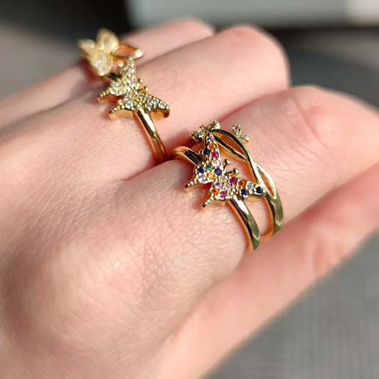 エレガントな調整可能な蝶のリング、きらめくマルチカラーのキュービックジルコニア、18金ゴールドコーティング